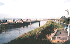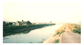名神高速道路をくぐると両岸に家が多くなってきましたし、工場も並んでいます。水門川と国道が接近してきたからでしょう。すぐ東の堤防は、揖斐川です。先の方に 排水機の建物 が見えてきました終点間近です。此の排水機のおかげで洪水もなくなり堀田、水屋も消えてきたのです。