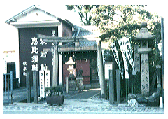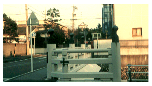 出発点は、JR大垣駅前の道を東へ100m程歩くと橋が架かっています。橋の向こう側には、大垣祭りに練り歩く山車の一つである恵比寿山車の保管庫と神社があります。おや!道標もありますねぇ。この橋の架かっている川が水門川です。ここから下ってゆくことにしましょう。