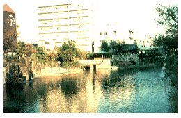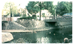 市役所の後ろを通り過ぎしばらく進むと川幅が急に広くなり大きく左にカーブしています。時計台、川船、茶席などが見え橋のたもとには、ひごい、水鳥がいっぱい集まっています。鯉に餌をやっている母子が見られ向かいのベンチには、読書をしている人も見えます。