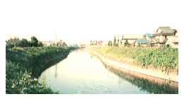この辺りまで来ると完全に農村地帯です。堤の向こう側に 水神さん の社が見えます。此の辺りの村には、 水屋 が沢山ありました。今は、其の面影として石垣の有る家が多く見られます。