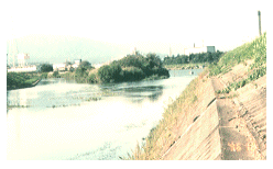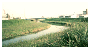 名神高速道路をくぐると両岸に家が多くなってきましたし、工場も並んでいます。水門川と国道が接近してきたからでしょう。すぐ東の堤防は、揖斐川です。先の方に 排水機の建物 が見えてきました終点間近です。此の排水機のおかげで洪水もなくなり堀田、水屋も消えてきたのです。