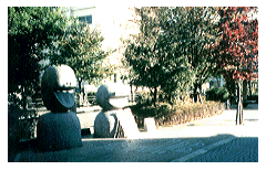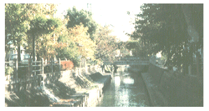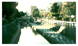 川の両側は、遊歩道になっています。暖かい日中には、熟年のカップルから高校生のカップルがなにやら楽しそうに語り合いながら散歩しているのが見られます。うらやましそうに見とれていると街路樹にぶつかりますよ。西側の散歩道を少し歩くと滑稽な石の人形が建っていますよ。