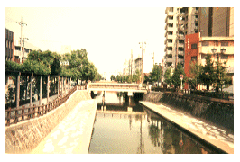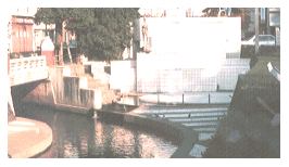 駅前通りを横切って歩いてくると、川が合流しています。合流している川の方を見ると何か楽しそうです。憩いの場が設けて有ります。私の子供の頃は、川の水が工場排水で色が変わっていましたが今は魚が住んでいます。