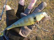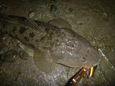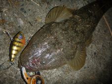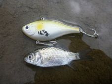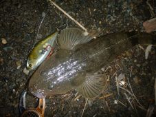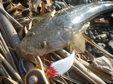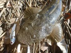 先行者が場所を移動したので、少し時間を空けてカーブの頂点部へ入ってみたが魚の反応はない。このエリアで粘っても無理っぽかったので下流域へと車を走らせた。2か所目では、アスリートバイブSS7からスタートしたが反応はない。前述のLV200と一緒に実家に置いてあるルアーBOXの中から掘り出したバークレーのバイブ、フレンジーラトラー(実測16g)に交換すると、あら不思議・・・1投目でヒット。さすが、何百万ドルも掛けて研究施設で開発されたフレンジーシリーズのルアーだ。ヒットした魚はいかにもコチっぽいファイトで、サイズはソコソコ大きかったのだが残念ながらフックオフ。