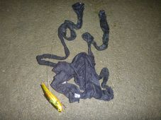 しかし、この判断が大失敗・・・間もなく旧レンジバイブ90Sにモソッとアタリがあった。ハンドルを素早く回してフッキング。相手の正体は分からないが、強くは引かずグネグネと泳ぐ。何だろう・・・疑問に思いながら引き寄せ、抜き上げると黒いタイツだった。これにはビックリ。今年4月に派手なブラジャーを釣った時以来のショッキングな出来事。引き寄せてくる際、正月に上げる凧のシッポのような長くて黒い生地がユラユラと水中を漂っていたに違いない。そんな水中の光景を想像したら、流石に気持ち悪過ぎた。