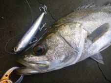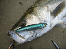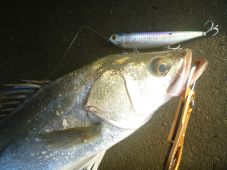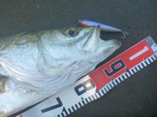 サイズアップを期待してルアーを投げ続ける。サミー128に再びヒットしたが、ルアーと同サイズのセイゴ。引き寄せてくる際にフックオフした。この魚が出てからは、パタリとボイルが止んでしまった。本命魚の活性が上がったのは45分間程度。ボイルはなくなっても水底に潜んでいる事も考えられるので、少しずつ移動しながら我慢強くキャストを繰り返していると30分後にチャンス到来。サミー128にドカンと出た。魚の出方は良かったが、引き具合からして70cmには届きそうもない。釣り上げたスズキは色黒の66cmだった。