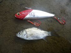 針掛りしてバラしてしまったので、諦めつつも同じコースにZBLバイブ80-20Gを通すと再びヒット。同じ魚なのか、別の個体なのかは不明だが、魚の顔は確実に見たいので慎重にやり取りして引き寄せた。水面に顔を出したのは、ファイトの割には小さなクロダイ(34cm)だった。この時期、このエリアにクロダイがまだ残っている事を知り、ちょっと嬉しくなった。やはり近隣河川に比べ、水温が高めに推移している事が理由なのかも知れない。