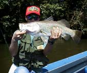 朝、6時55分。稚アユの色と大きさに近いアスリートのトウィッチングでアシ際を狙っていた時にそいつはドカンときた。ジャンプした魚を見た時に自分の目を疑い、思わず「でかい!」と声に出してしまったほどの大きさ。これまでのバス釣りでは体験したことがないファイトを楽しみながら、数分掛けてランディングした。口には拳が入ってしまうほどの大口バス。ドキドキしながらメジャーで計ると残念ながら60cmまでには僅か1cm足りない59cm。しかし大満足〜!嬉しくて特別コーナーを開設しました。詳しくはこちら。