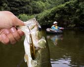 相棒Iはヒグラシを捕まえ、羽にワームフックをチョン掛けをして、散々ルアーで攻めていた倒木周辺にポトンと落とすこと暫し。ジジジジジィーと小刻みに羽を動かしながら移動するセミに、見事、小バスがヒット。もう大爆笑。やっぱりルアーは本物に勝てません。