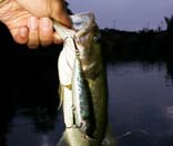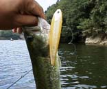 池の最奥部まで行くと、水面直下にウィードが生えているポイントを発見。ここでは、チャグバグが大当たり。今時、使っている人は少ないが、ラトルがカラカラとにぎやかで、程よいスプラッシュと機敏な首降りアクションが私のお気に入り。こいつでテンポよく5匹を釣り上げたほか、コンバットポッパーで3匹、ジッターバグJTで2匹、ドッグXで2匹と入れ食い。トップへの反応が悪くなった時は、シャッドラップ、シャローラビット、TDミノー、マイティーペッパーを使い17〜23cmの小バスを合計17匹をコンスタントに釣る事ができた。一方、相棒はその後コンバットポッパーで11匹(18〜26cm)とオリザラ、フラットフィッシュ、メガバスX70で1匹ずつ釣り、合計17匹。釣った数は同じなんだけどねぇ。何だか釈然としなかった。
