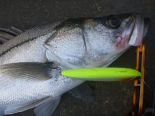 バグリー・ウォーカー、ジプシーペンも試したが、やはり本命魚の反応が良いルアーはサミー128だった。釣りを始めて3時間半が経過。ボイルがなくなり、そろそろ納竿の頃合いかと思ってる時に、サミー128が空中に吹き飛ばされる爆裂バイトがあった。80cm級のスズキなのだろうが、水面にルアーを浮かべておいても追い食いはナシ。これを最後に沈黙したので納竿とした。嫁さんが釣ったスーパーランカーサイズのスズキは羨ましい限り。自分も2本釣ったので、今回はまぁ良しとしよう。