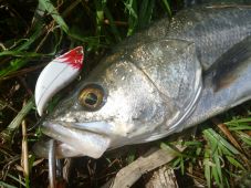 ラパラCD9に反応はなく、ウィッギーに交換すると、いきなり70cm級のスズキが足元でルアーを吸い込んで反転。確実にルアーを持って行ったのだが、スッポ抜けた。ダメもとでキャストしなおすと、再びヒット。しかし、この魚も針掛りしなかった。根掛かり防止のため装着しているダブルフックがマズかったのか・・・。折角のチャンスを逃し、悶絶しながらもウィッギーを投げていると、またもや足元でヒット。最初にヒットした魚に比べ小さかったが、久しぶりのスズキのファイトを堪能しつつランディング。今シーズン最初の1匹は60cmだった。他にも魚がいるハズなので、ウィッギーを繰り返しキャストした反応しない。スーパースプークJr、K-TEN BKSP9、ビーフリーズ78Sを投入し様子を伺ったが不発。いつしかマイクロベイトの姿は消え去り、水面が穏やかになって明らかに時合が終了。